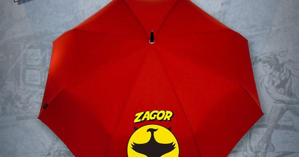 Di peso non eccessivo, il pratico ombrello di Zagor è composto di elegante tela rossa, è dotato di manico ricurvo con apertura a scatto e riproduce su uno spicchio il simbolo del personaggio e il logo della sua testata.